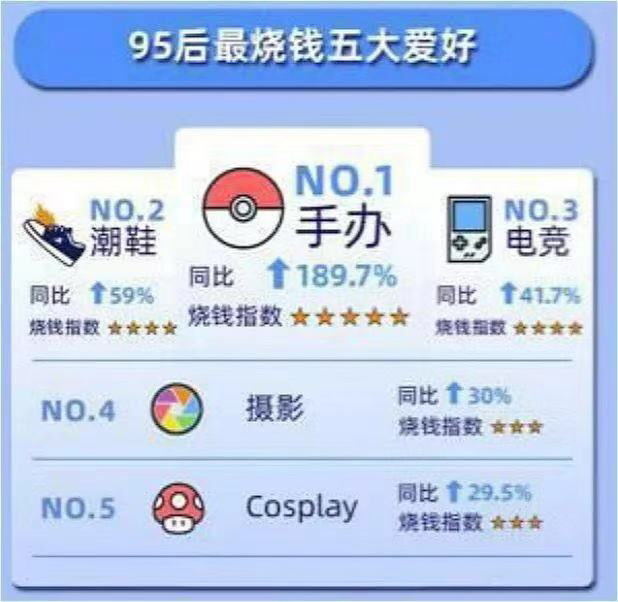 在最近(jìn)的(de)China Joy上(s∏€₹✘hàng),天貓發布了(le)《95後玩(wán)家(jiā≈•φπ)剁手力榜單》,指出了(le)當前95後最&ld ×quo;燒錢(qián)”的(de)5大(d≤₩'à)愛(ài)好(hǎo),分(fēn)别是(shì)手辦、潮鞋、電(®'αdiàn)競、攝影(yǐng)和(hé)Cosplay。